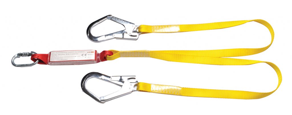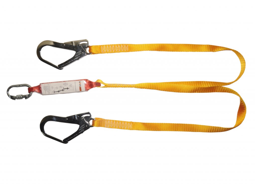 Double arm lanyard with shock absorber, carabiner and K-4 hook