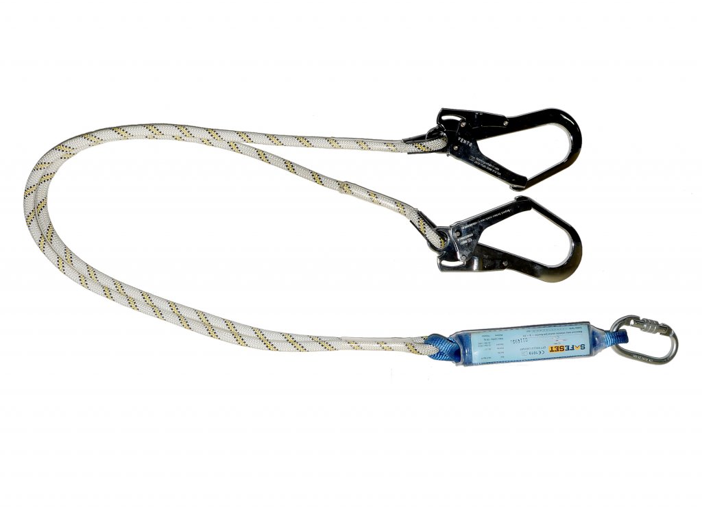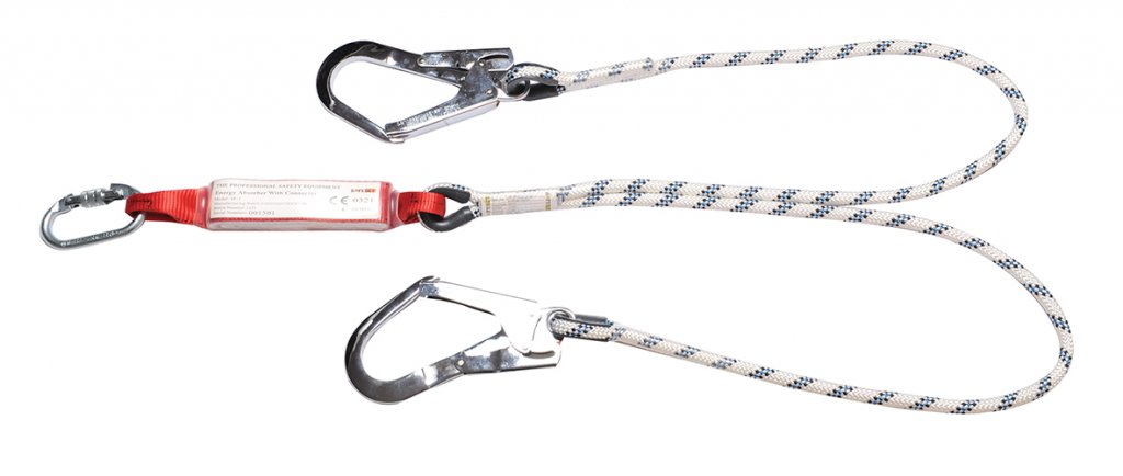 Double arm static rope lanyard with shock absorber, carabiner and K-4 hook